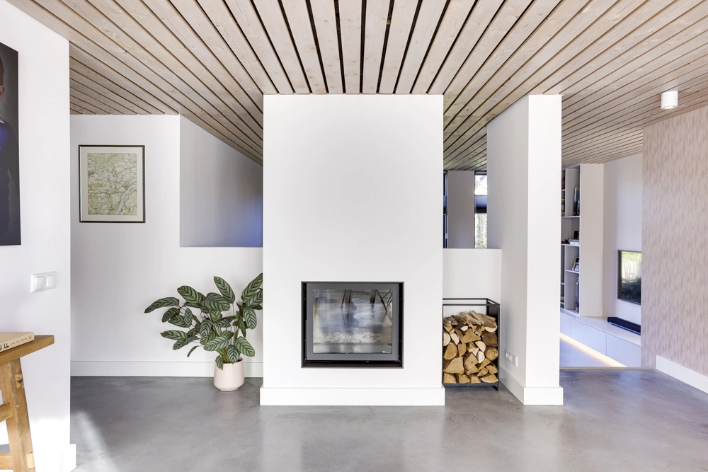 De wens was een modern, licht familiehuis te creëren met een elegante en karaktervolle uitstraling. De haard werd vervangen door een gezellige doorkijkhaard, zodat ook aan de eettafel genoten kan worden van het gezellige haardvuur! Er kwam een lichtgrijze betonvloer, zodat er een mooi contrast ontstond met het karakteristieke houten plafond.