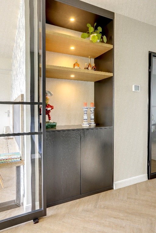 Praktijkvoorbeeld: in een gerealiseerd project zat een gek ‘loos’ hoekje in de woonkamer. Door de muur van de keuken iets te verlengen, ontstond een nis. Zo kon de speeltafel gezellig in de keuken staan zonder de looproute te blokkeren, en werd de nis de perfecte plek voor een maatwerkkast; onderin speelgoed, bovenin decoratie. Stijlvol en praktisch tegelijk.