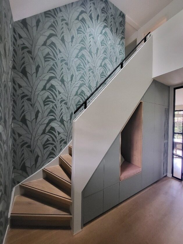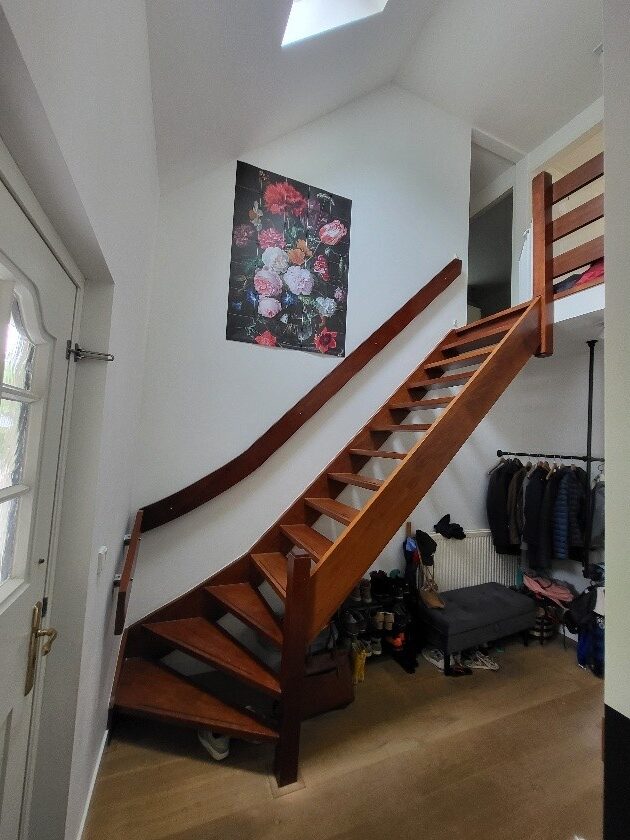 Bij dit gezin was de hal rommelig, omdat er geen goede opbergruimte was. Door maatwerk ontstond er een stijlvolle kast met plek voor alle jassen, tassen en schoenen, én werd de radiator weggewerkt. Ook de trap kreeg een veilige afwerking. Het resultaat: een stijlvolle én praktische entree die past bij de rest van het huis en waar iedereen blij van wordt.